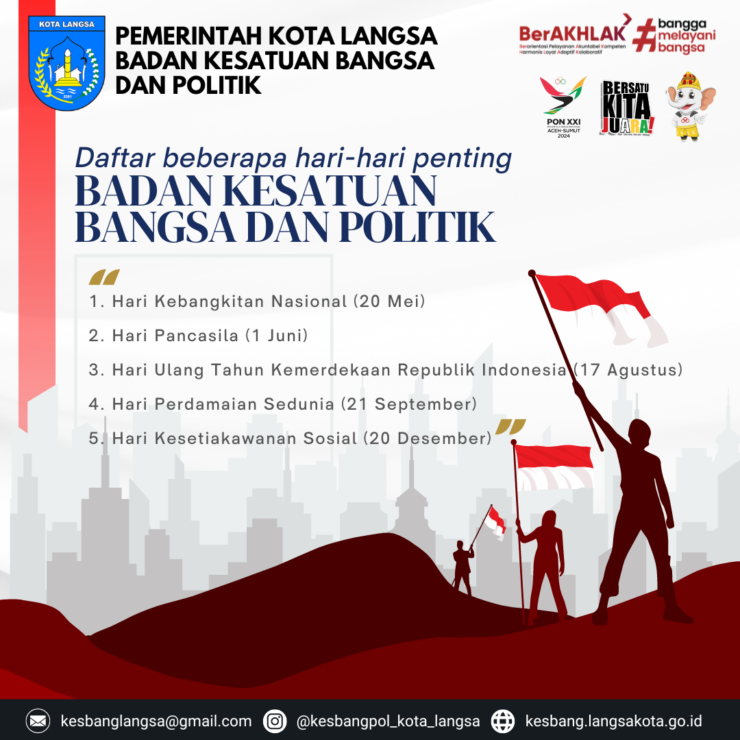 Berikut adalah daftar beberapa hari-hari penting yang umumnya diperingati oleh Badan Kesatuan Bangsa dan Politik (Kesbangpol) mulai dari Januari hingga Desember: